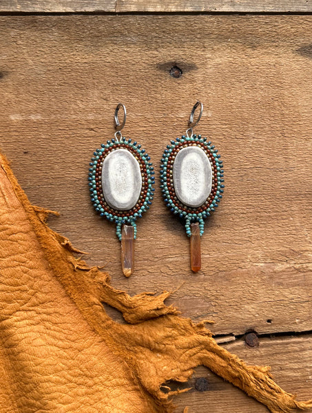 Inspired by the colors and vibes in Missoula, MT. Beaded earrings made with premium Miyuki beads, teardrop Whitetail Antler slices, and Aura Quartz points.